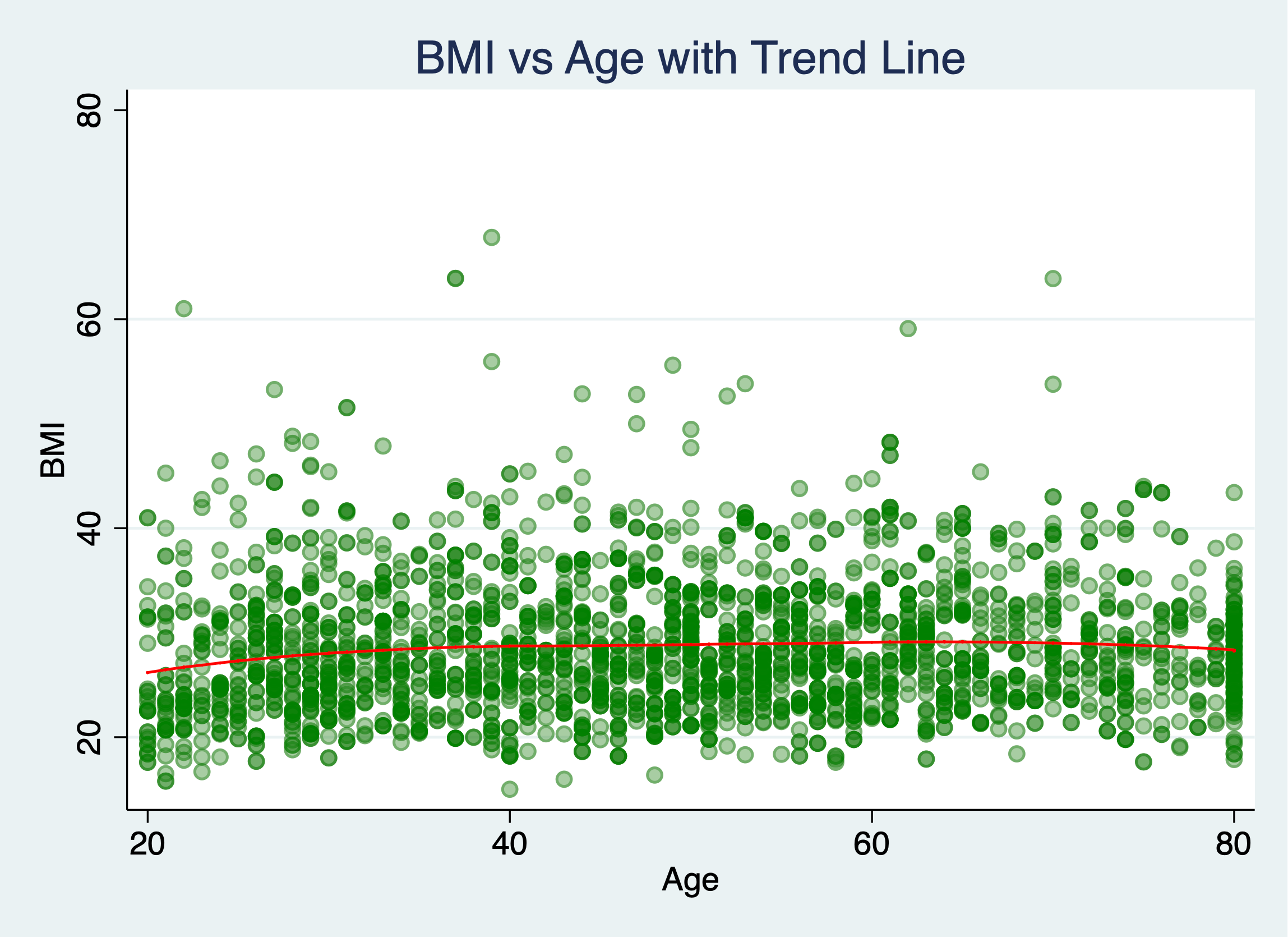 twoway (scatter BMI Age, mcolor(green%40) msymbol(circle) msize(medium)) ///